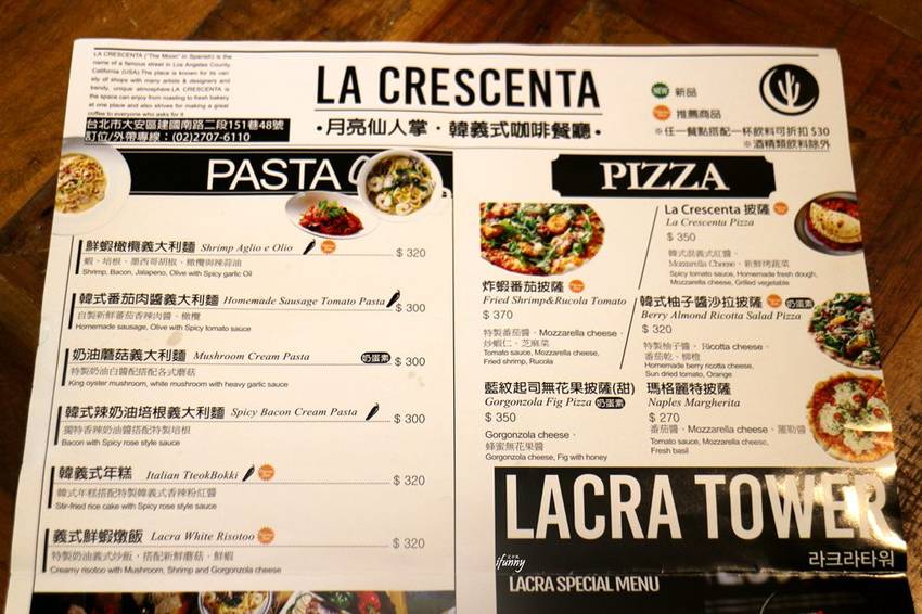 LaCrescenta是西班牙文”月亮”的意思,是美國著名的街道,以獨特的時尚和藝術氛圍聞名。因此在韓國首爾開設的第一家店就是結合美食、藝術的餐廳,沒想到受到當地年輕人的歡迎,進而在大邱、弘大,又開了兩家分店。創辦人之一的台灣人,在2018年2月把在韓國大受好評的韓義式料理原汁原味搬回台灣。