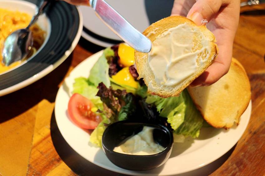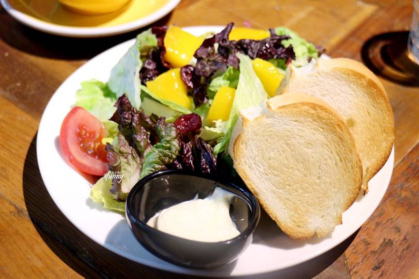 附上了兩片麵包及檸檬沙拉醬,那酸甜的檸檬沙拉醬非常清爽,令人非常喜愛!沙拉的調味也很棒,清爽又開胃。