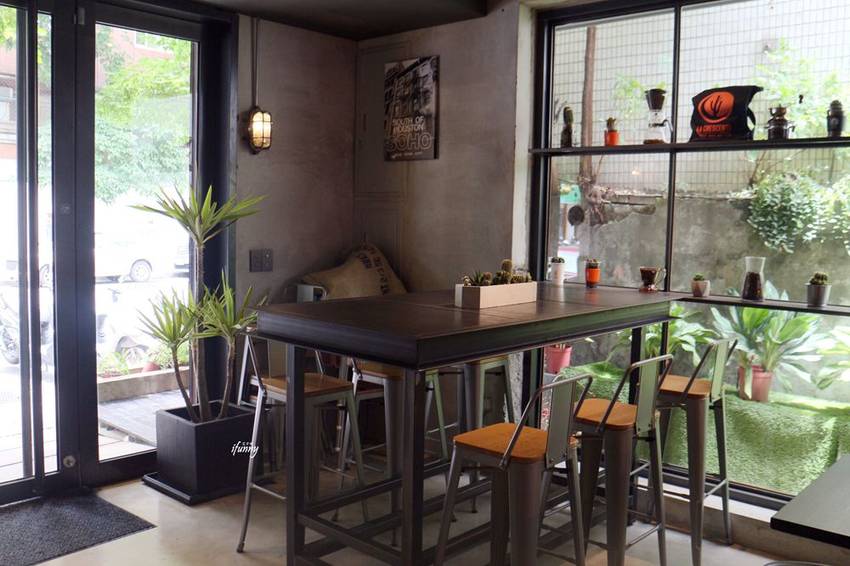 一樓入門口左側的高腳椅區,在格狀玫璃窗及綠意的搭配下,顯得相當地愜意。