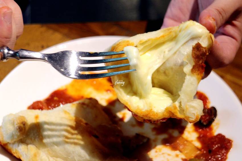 原來這全是馬札瑞拉起司的內餡,雖然因拍照時間而無法牽絲,但冷掉的起司更具Q勁,越咀嚼越發香氣。而一旁附的是韓式辣醬混合義式蕃茄紅醬,有別一般的披薩只有酸甜,這個辣醬的表現實在太出色,酸甜帶辣勁,很特別又很好吃,令我們差一點想追加個麵包什麼的,想把這個醬刮乾淨到一點都不剩!
