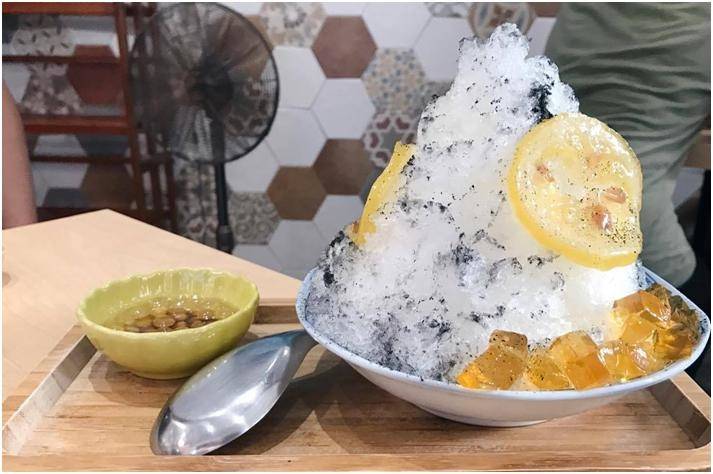所謂的墨雨其實是竹炭粉.沒有味道但具吸濕解熱的功能.自製的糖漬檸檬甜中帶苦,可以搭上旁邊黑糖煮的白玉珍珠.這個冰品稍嫌簡單了,配料也不夠多.如果可以把茶凍換成阿里山愛玉應該會更出色..