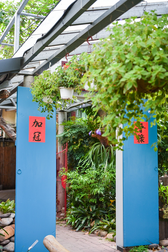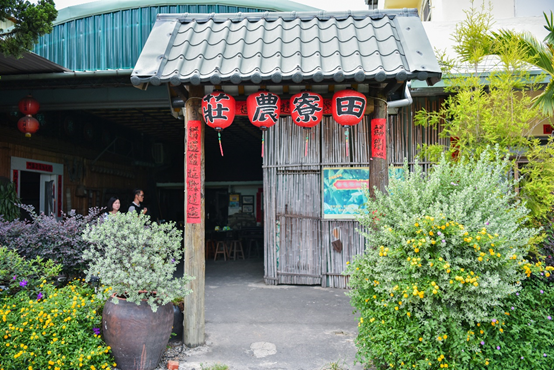 再往前走後就看到古色古香的木門上頭用紅色燈籠寫著田寮農莊