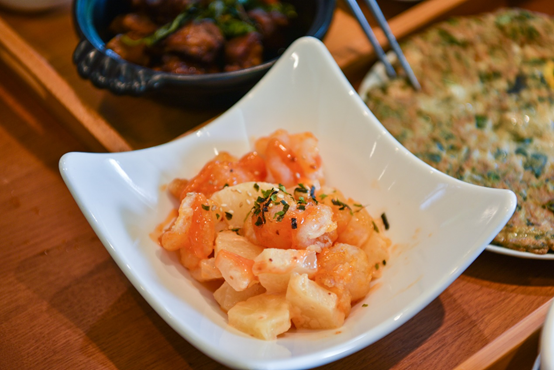鳳梨蝦球使用番茄醬加上美奶滋及花生的結合