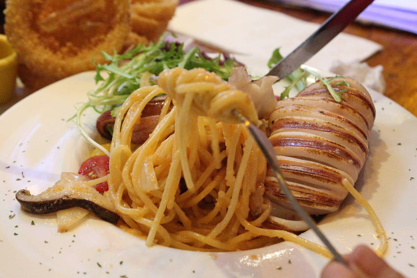 所以我們點了洋蔥圈、明太子漁夫中卷義大利麵,