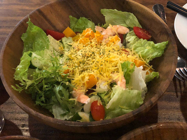 久等了的木盆沙拉,用木盆裝沙拉看起來就非常可口,裡面有美生菜,番茄、甜椒、番茄,起司及藍鑽蝦,
