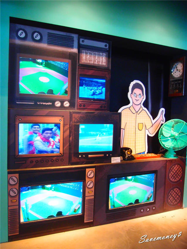 除了有以前拍攝的紀念短片,還有三個螢幕是鎖定在室內的棒球練習場
