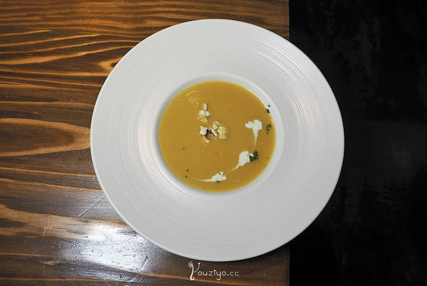 今日湯品是南瓜濃湯,口感不會太濃、夏天很喝來較為清爽,上頭擺了幾顆爆米花點綴,既可愛又增添口感。