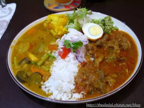 白飯如楚河漢界般,讓兩種口味的咖哩各自守著自己的領土,椰奶雞肉有著傳統的椰奶風味,卻又混著傳統印度咖哩濃厚的香料氣息,微辣不辛,雞肉很嫩,會讓人忍不住一口接一口。