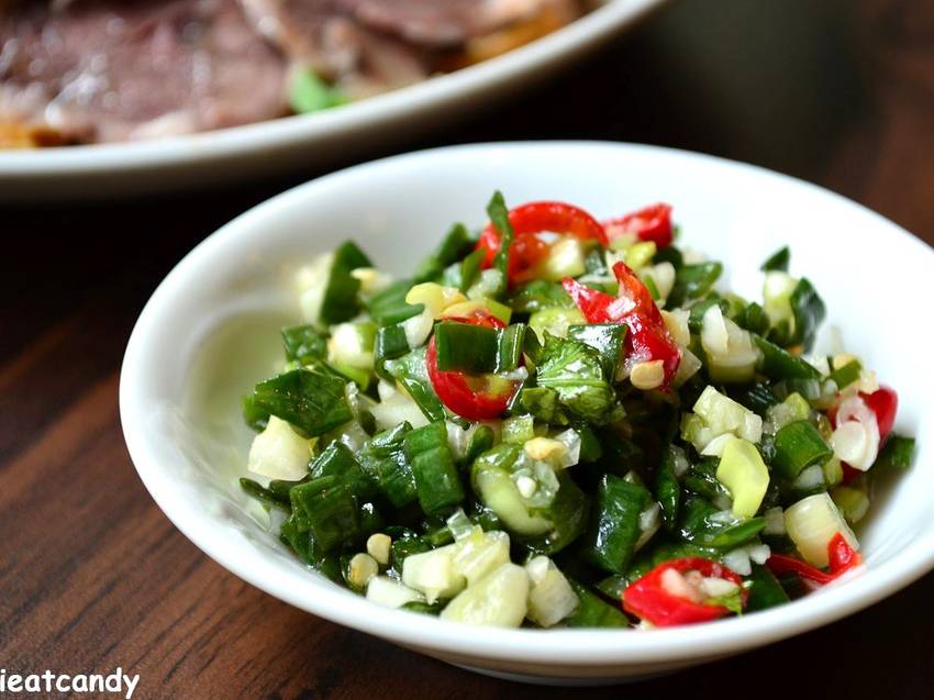 老闆說想要吃黃金比例,就是醬油、豆瓣醬各兩匙,其他各一匙,如果你是那種來就一定要趕快吃上東西的人,直接裝些特製醬就非常夠味啦!愛伊特單沾取一口,只能說那口感非~常~豐~富,醬油的鹹、豆瓣醬的濃、芝麻醬的香、朝天椒的辣等等,你會來不及接應它接踵而來衝出頭的風味。