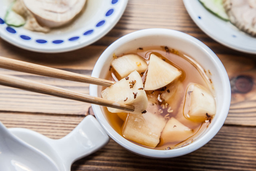 將白蘿蔔切成適口塊狀,再加入桂花蜜一同醃漬,讓桂花香附著在蘿蔔之上,蘿蔔酸甜脆感之間還飄著清雅的桂花香