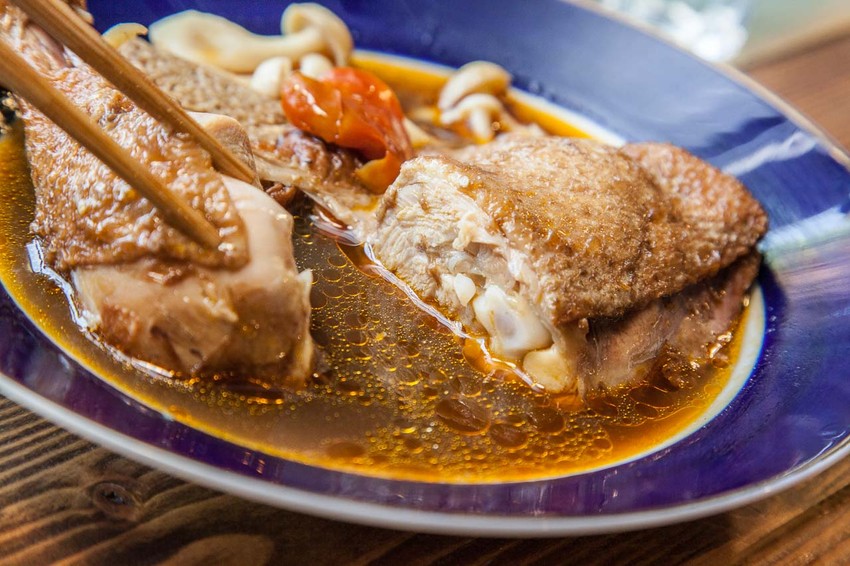 精燉麻辣湯雞腿是使用整隻的大骨腿下去跟特製麻辣湯底一起精燉,雞腿肉質超厚實!