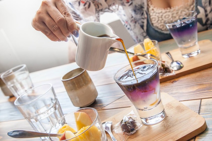 夢幻的紫色可不是一般的蝶豆花唷,而是主廚萃取自紫高麗菜的天然色素,好吃好看又健康,吃之前加入特製的梅汁,因為不是蝶豆花,遇到酸也不會變色,加入梅汁口感冰涼酸甜,生津止渴