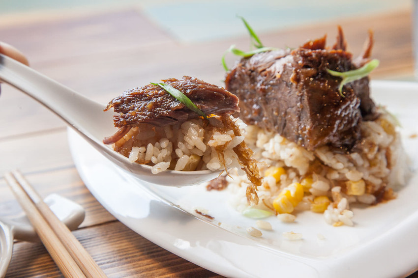 牛排有多嫩!?用筷子就可以夾開了,牛排燉煮的超入味!肉質鮮嫩多汁,肉香四溢,牛腱的膠質黏嘴濃稠,每一口都帶給你紮實的肉感肉香,搭配下面的蛋酥飯一起吃,鹹鮮的牛排夾著米飯一起入口,飽嘴舒服!