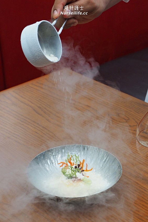 這一道是豆腐芝士蛋糕,主廚會端上來給予個特別秀,急速冷凍的豆奶冰像雪花般飄散在蛋糕的周邊,就算你來雅吉不想要吃菜,爆肝推薦你就點酒和這一道甜點就好了。