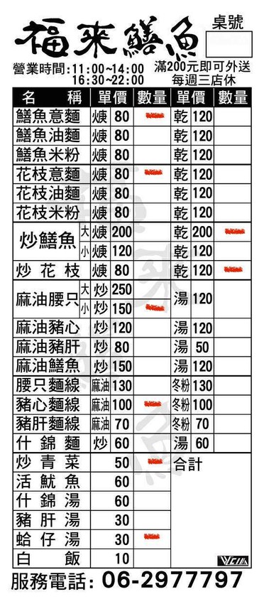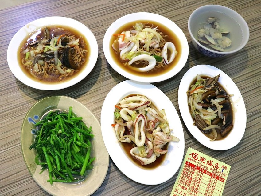 鱔魚意麵(乾/焿)/ 乾炒鱔魚 / 花枝意麵 / 乾炒花枝 / 麻油腰只 / 麻油豬心麵線 / 蛤仔湯 / 炒青菜。