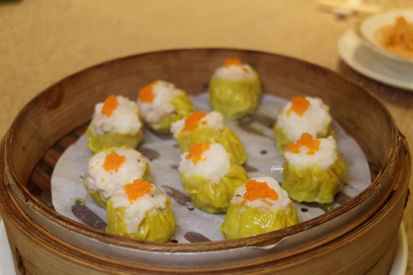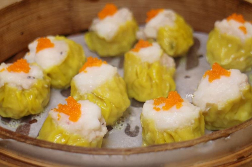 港點中不可或缺的就是燒賣了!這採用豬後腿肉製成的內餡,上面淋上花枝漿並撒上鮮橘色的魚子點綴。咬下後盡是豬肉的鮮美多汁,還有脆口的花枝及跳躍的魚子,每咬一口都是幸福滋味啊!