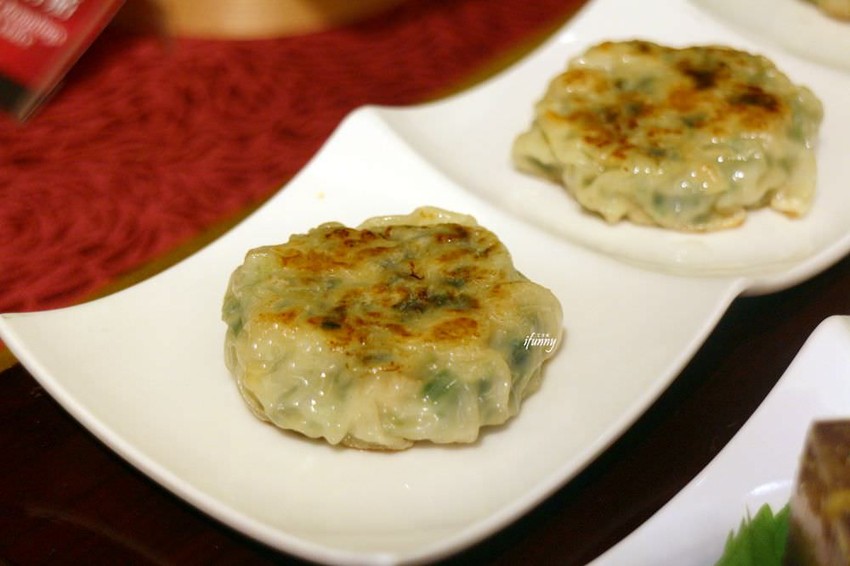 這韭菜餅外皮也是透出韭菜的翠綠,加上煎到焦黃的外皮,看來就十分地誘人!萬師傅採新鮮韭菜提味,並加入花枝、蝦仁及香菇,讓這韭菜餅多了鮮味,這真是好吃得不得了!