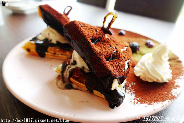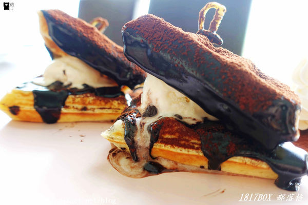 鬆餅夾冰淇淋加上巧克力醬,最上層再灑上巧克力粉,