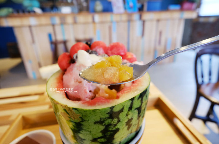 堆高高的,吃的時候,粉圓和西瓜球滿容易掉下來