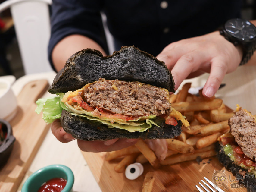 麵包常常在漢堡當中都是被忽略的角色,那種孔洞很大蓬鬆劑放好放滿的麵包體,咬下去就想翻白眼阿!樂。野食的漢堡麵包是自家配方跟工廠合作製做的竹炭麵包,切面煎得有些焦脆,咬下去口感富有彈性不會太鬆散或乾口,很不錯。