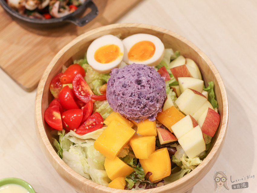 美美的紫薯泥,是店家早上蒸的,擁有大自然最美的調色,旁邊的蔬果新鮮豐富,正值夏季還有我最愛的芒果,超甜!旁邊一小杯的沙拉醬,沾一口覺得好特別,沒有我最害怕的美乃滋的油膩感,特地問了老闆原來是用優格加上柑橘調配的沙拉醬料,清爽的香氣又不會太酸,醬料雖只是小配角,卻很有心。