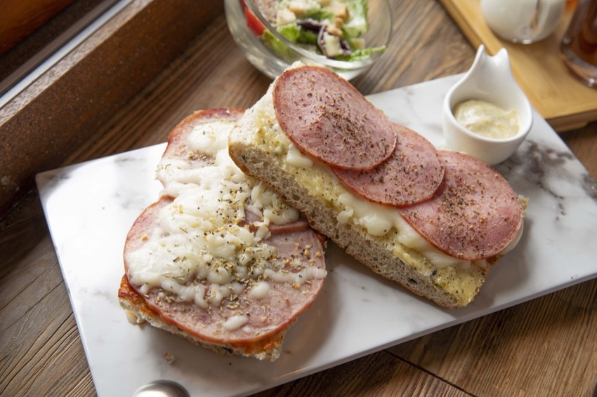 佛卡夏雙拼,是火腿與培根雙拼,上頭有一片厚厚的起司與香料,佛卡夏與起司結合經過烤箱烤得外酥內軟,要趁熱吃唷