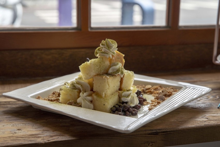 小型方磚的吐司,吃起來外皮酥酥脆脆的,搭配旁邊的蜜紅豆以及抹茶冰淇淋吃,紅豆非常綿密,這一款甜度偏甜適合螞蟻的朋友😂