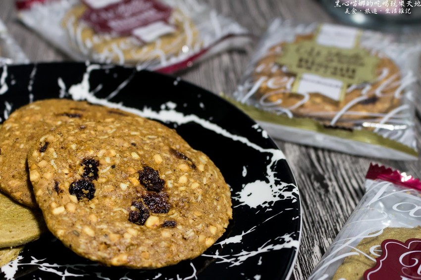 這一片裡頭的穀物種類非常多,大麥、燕麥、小麥、糙米、山藥、黑糯米、薏仁、粟米、菠菜、番薯葉……等等,吃起來…基本上不甜,但會越嚼越香,甜度來自上頭的葡萄乾,輕輕的微甜果香,讓高纖粗食變得比一般餅乾還要好吃、耐吃上許多。