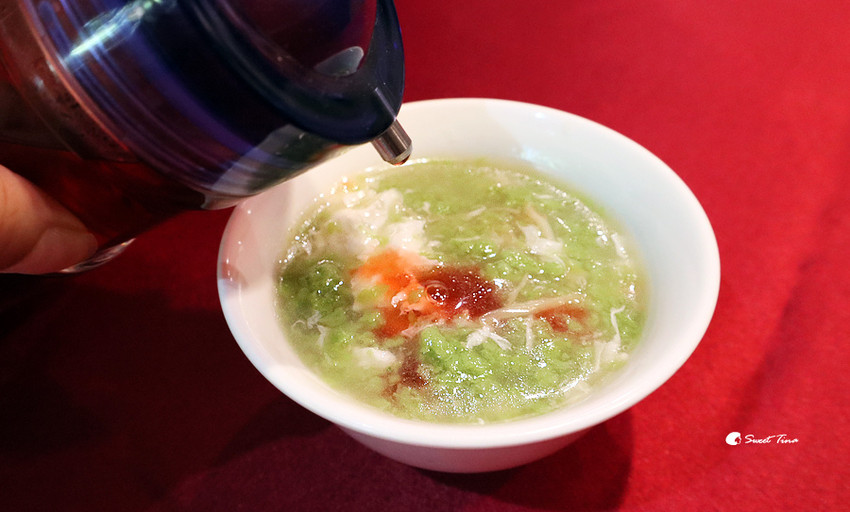 翡翠瑤柱羹 - 這也是一道相當費工的料理,裡頭綠色的食材是店家將菠菜壓成汁後再調配,所以口感帶點Q彈,和蛋花海鮮羹超級合拍的,是道不能錯過的湯品。