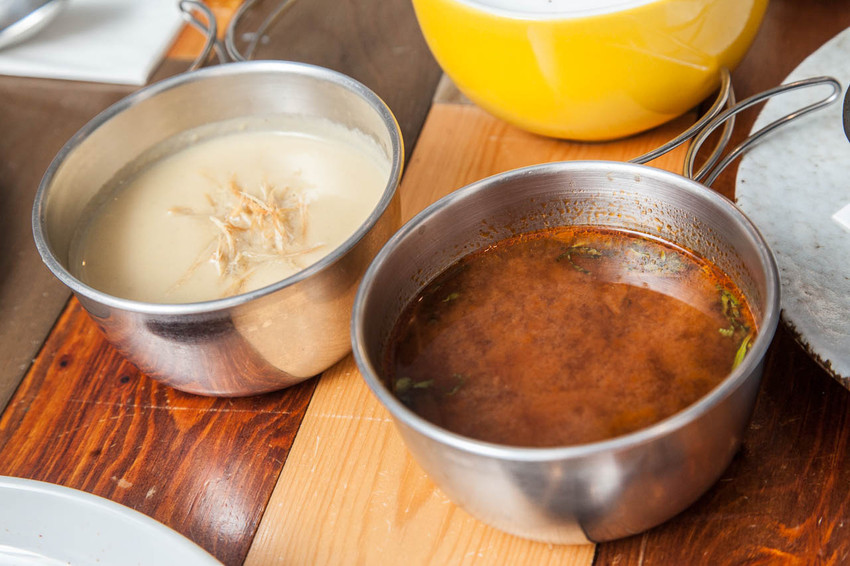 義式蕃茄海鮮湯&牛蒡奶油濃湯,湯碗是用露營杯盛裝,義式蕃茄海鮮湯帶點微微番茄果酸香,喝的到海鮮的鮮味外,還可以吃到蝦肉及魚肉丁呢,牛蒡奶油濃湯牛蒡香氣淡淡的,奶油香氣稍稍蓋過牛蒡特有的苦味,還帶有雞高湯清甜的香氣,口感平衡拿捏得剛剛好
