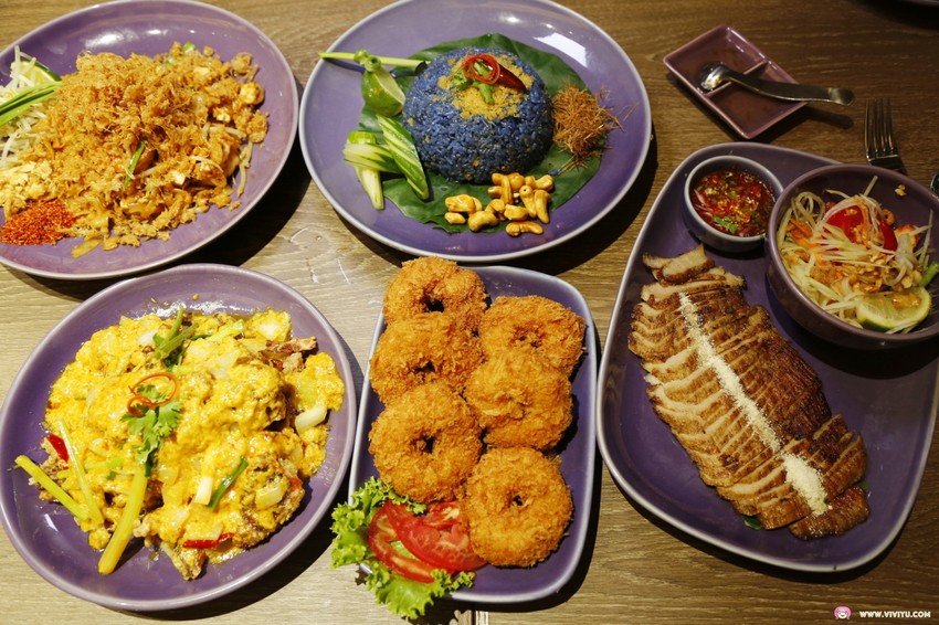 吃泰式美食似乎盤子是少不了,瓷盤是選用視覺强眼的紫色餐具,放上些白飯再將每一種菜餚都夾上去,所有食材拌一拌超美味又下飯,光想到口水就快流下來。
