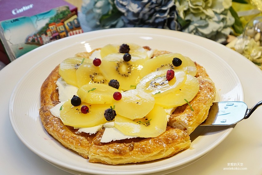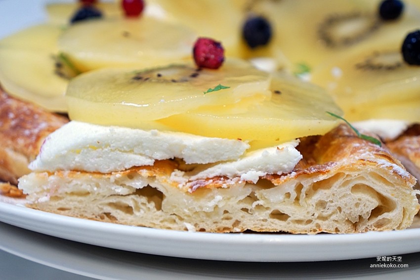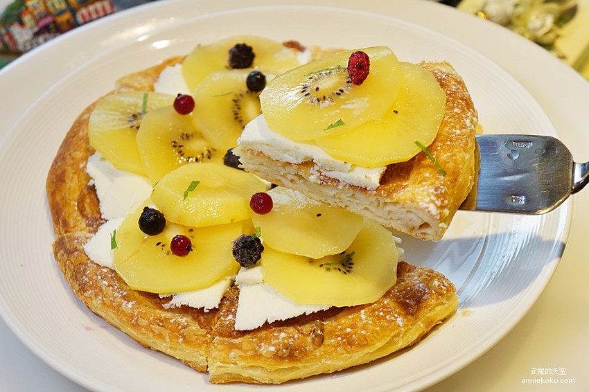 金黃的奇異果切片鋪在PIZZA上面,再用酸甜的黑醋栗、紅醋栗以及莓果搭配,光視覺上就很夢幻,最特別的是夾層中的鮮奶油,這可是甜披薩最美味的關鍵,鮮奶油冰過後一點也不甜膩,反而是像鮮奶冰淇淋的口感,冰冰涼涼香濃滑順,搭配餅皮實在太好吃了。
