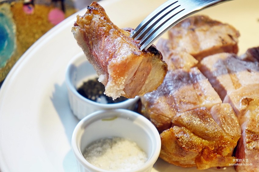 窯烤40-60分鐘的伊比利豬豬肉依舊保持豐美風味,豬皮、瘦肉與油花分布都相當均勻,肉質也很粉嫩,吃在嘴裡是滿滿的幸福感啊。