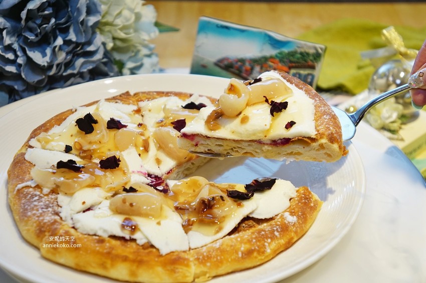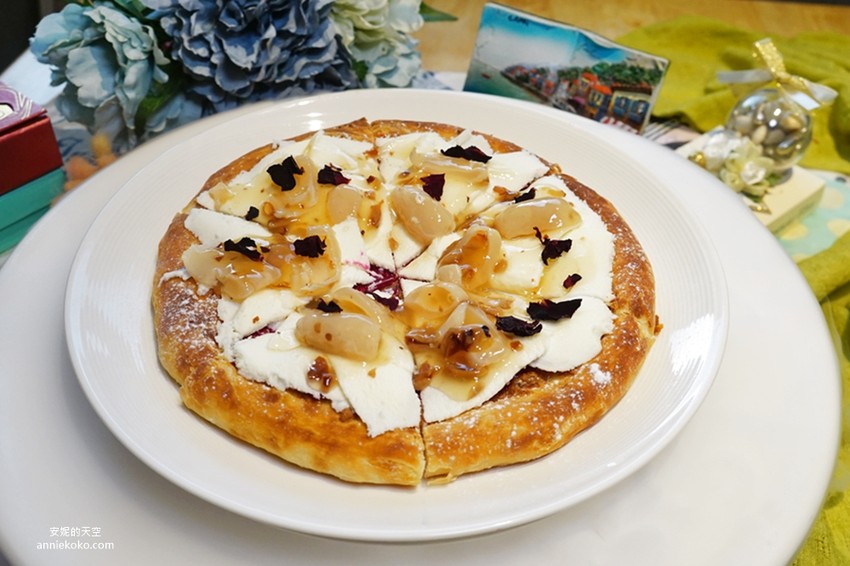 鋪滿鮮甜荔枝的甜披薩佐上玫瑰醬,花香與果香氣息融合,別有一番滋味。