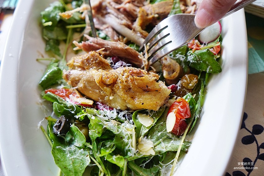 油封鴨非常嫩口,完全沒有腥味,外皮烤得酥脆,鴨肉卻是相當細緻又嫩,好吃得不得了,不管是單吃生菜或是油封鴨肉,口感都相當特別。