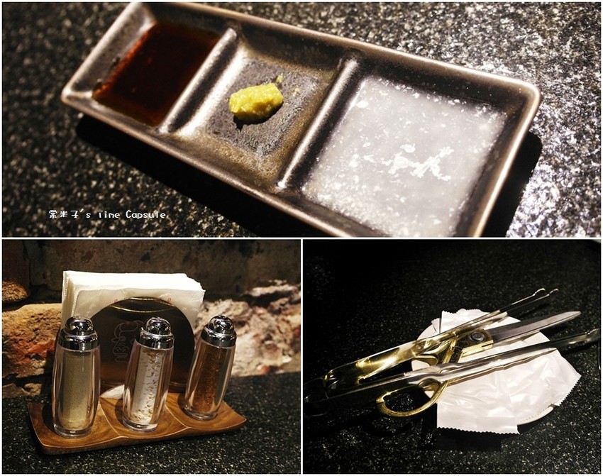 由左而右是主廚特製燒肉醬、柚子胡椒、檸檬汁,