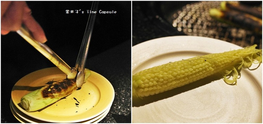 帶皮烤的玉米筍在店員巧手服務下不必弄髒手就有清甜玉米筍可以吃,