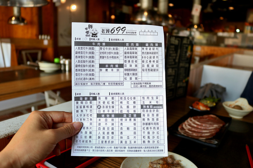 為了避量食材浪費,一次限點八樣(不含熟食),胖肚肚的上菜速度很快,我覺得八樣還蠻剛好的,一次點太多烤的速度跟不上放久反而不新鮮。