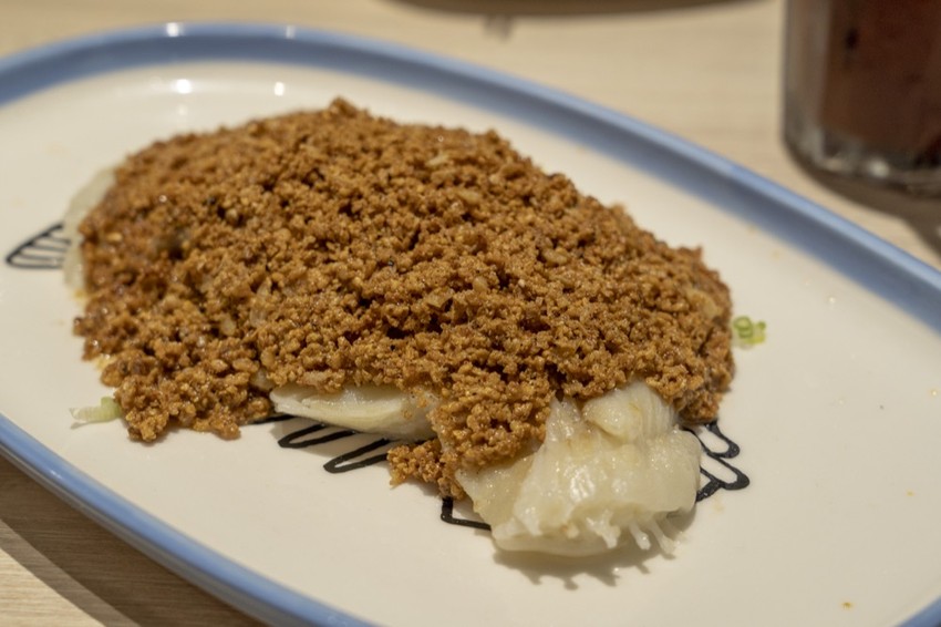 這一款居然是涼的,本來以為是熱呼呼的一道菜,雞肉搭配濃郁的芝麻及微辛辣的醬汁,吃起來肉質非常軟嫩,芝麻醬漸漸在口中化開,辣中帶麻~