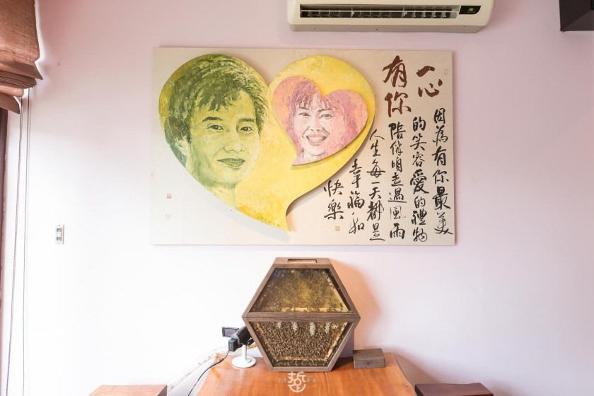 走進佳風蜜,兩片門板組合成一個心,老闆說這是『打開心門,用心感受幸福』,我到覺得這也是夫妻倆共結同心,一起打拼的意涵。所以在店裡,大量用”心”做布置,一句『花若盛開,蝴蝶自來。人若精彩天自安排』最能讓人共鳴。