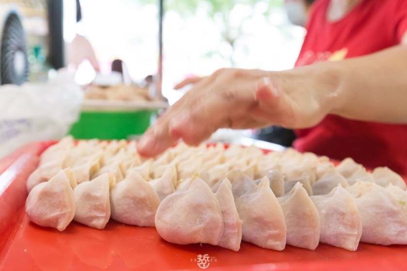 這裡煎餃特色是無油煎餃,口味有牛肉、鮪魚、豬肉韭黃、九層塔以及新鮮蝦仁。熟練的包水餃功夫,將餡料舀起在皮上一抹,兩個虎口成三角形一掐,便包好一顆圓滾滾的水餃。