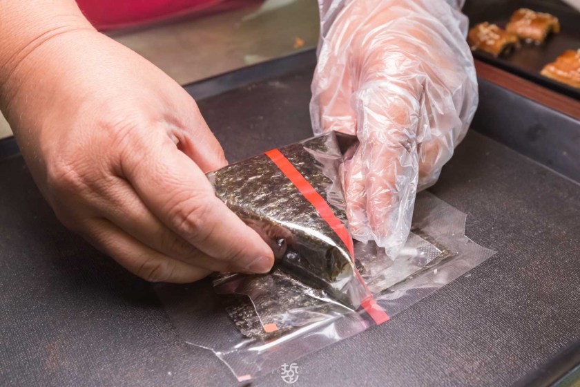 3.將海苔對折包覆,將膠帶與紅線平行黏貼以利拆封即大功告成。