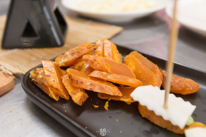 刮除微焦的表皮後切片,串上蘿蔔與蒜苗食用,口感棒極了。