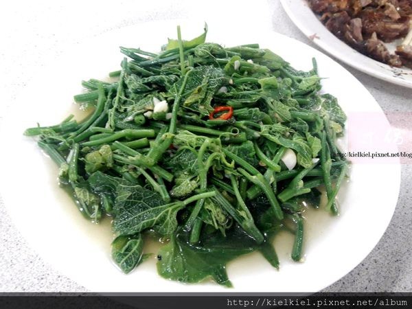 自家哉種蔬菜,大火熱炒後的龍鬚菜纖細卷曲,特有的粗糙表皮觸感很有嚼勁。
