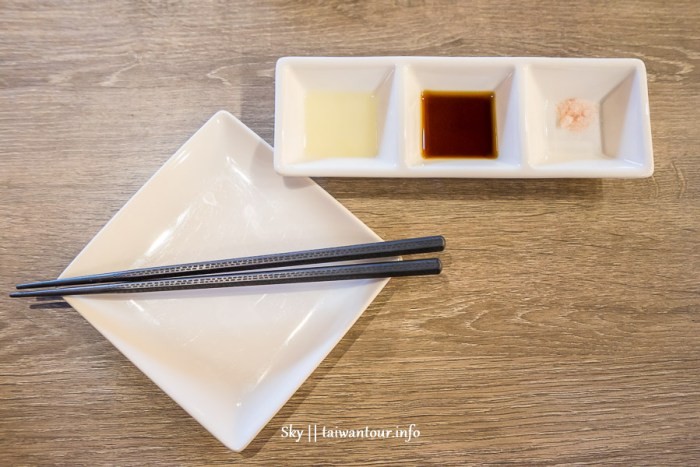 沾醬有檸檬汁、日式醬油、玫瑰鹽,