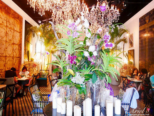 綻放著優雅紫色系的蘭花,配上華麗的水晶吊燈