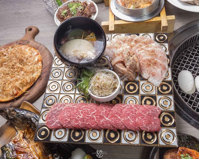 安格斯無骨薄切牛小排、安格斯極上厚切無骨牛小排、奇異超低溫霜降牛、主廚手作雙味松阪豬以及安格斯嫩肩小排以及日韓名物(小菜)。
