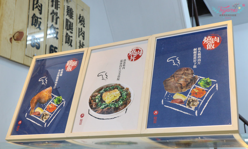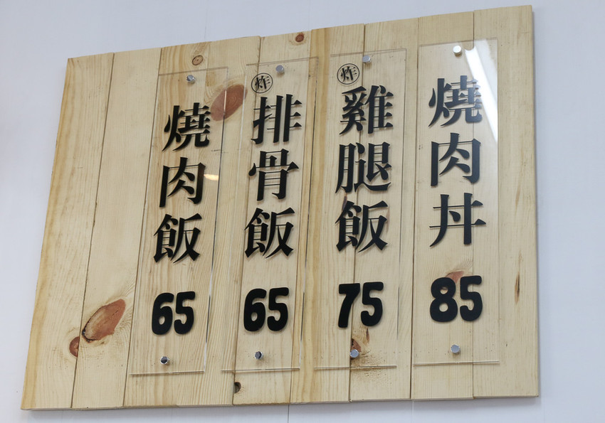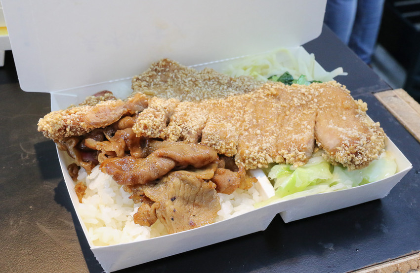 便當有3種:燒肉飯、排骨餐(炸)、雞腿飯(炸),可另單點燒肉$40、排骨$40、雞腿$45。