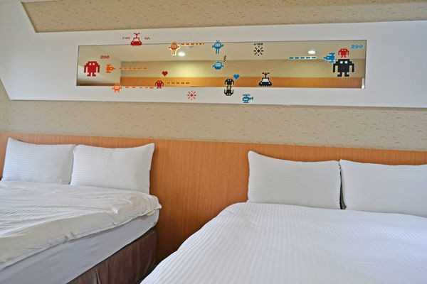 哇~~!看到這四人房真是溫馨又舒適的感覺,兩張大床以外還有畫桌及電視,採光及通風非常棒,而牆上還有可愛的壁貼,相當俏皮!