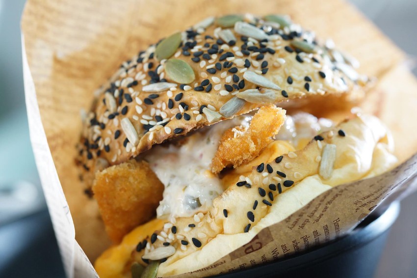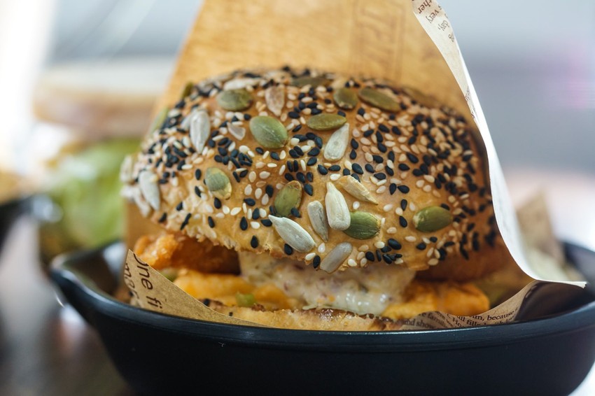 就算你原本不太愛五穀雜糧,味蕾也會被收買的五穀堡!飽滿的漢堡皮,沾上滿滿的黑白芝麻、南瓜籽及葵花籽,麵包本身軟中帶Q,用手指輕壓還會回彈的那種!五穀增加香氣,其中南瓜子及葵花子的脆口更是增加口感。
